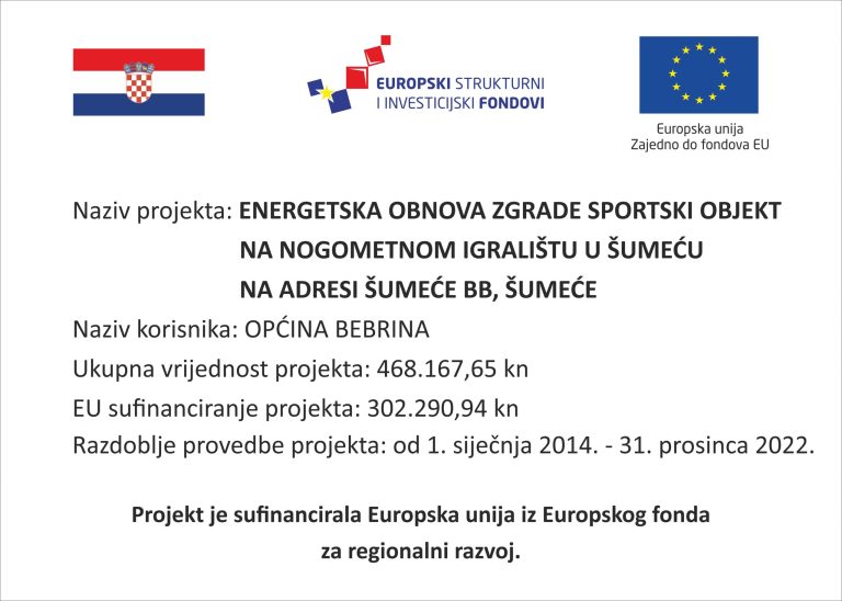Općina Bebrina kao investitor provodi projekt energetske obnove Sportskog objekta na nogometnom igralištu u Šumeću ukupne vrijednosti 468.167,65 kuna. Projekt je iznosom od 302.290,94 kune…